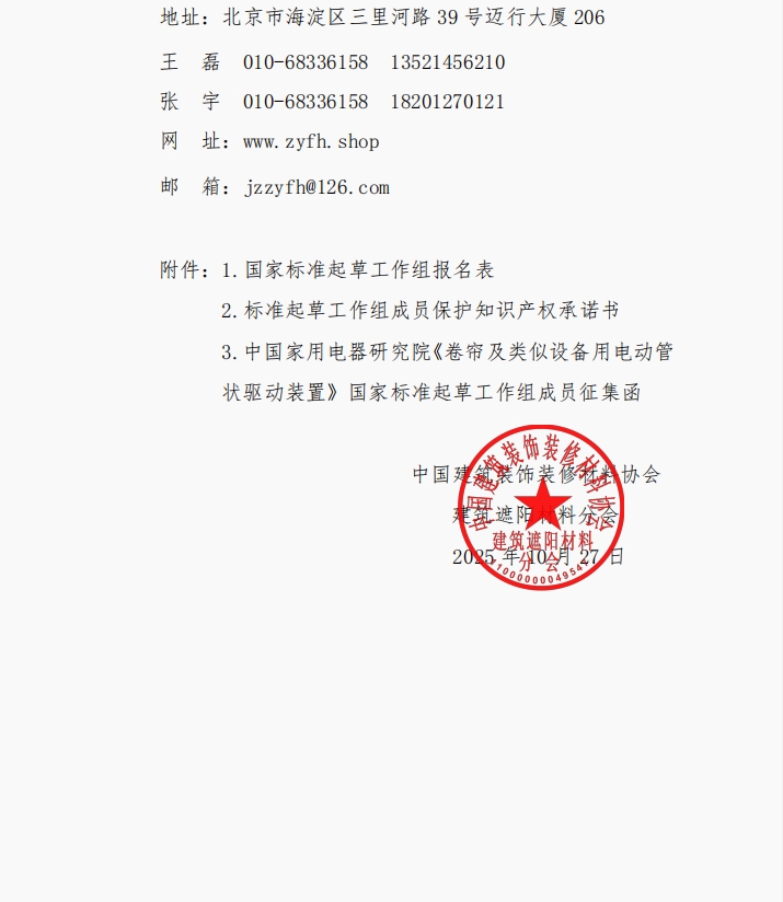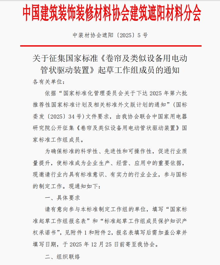 关于征集国家标准《卷帘及类似设备用电动管状驱动装置》起草工作组成员的通知